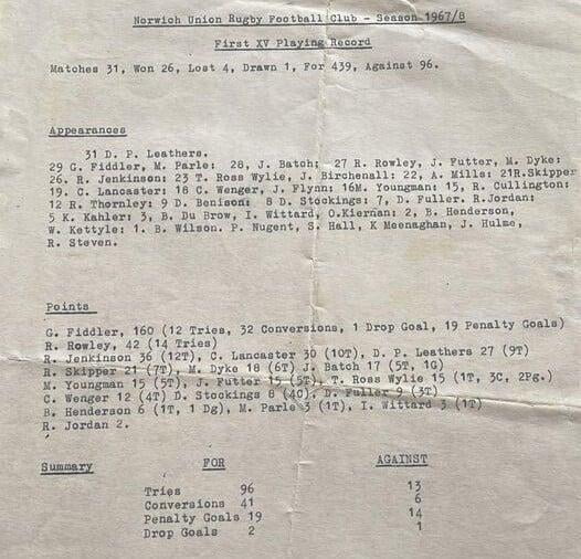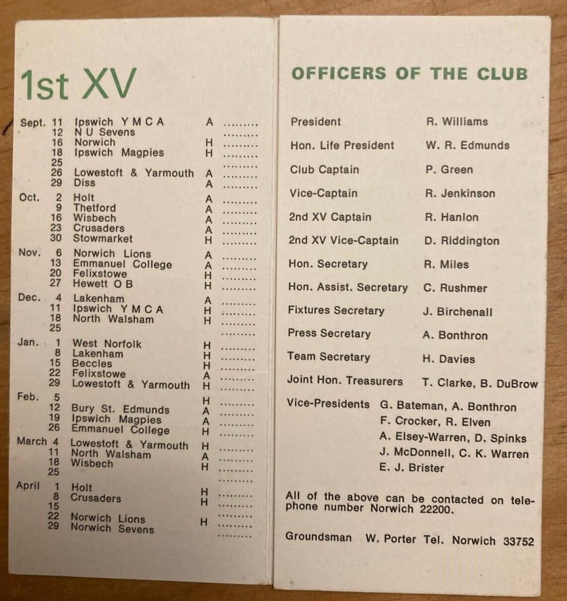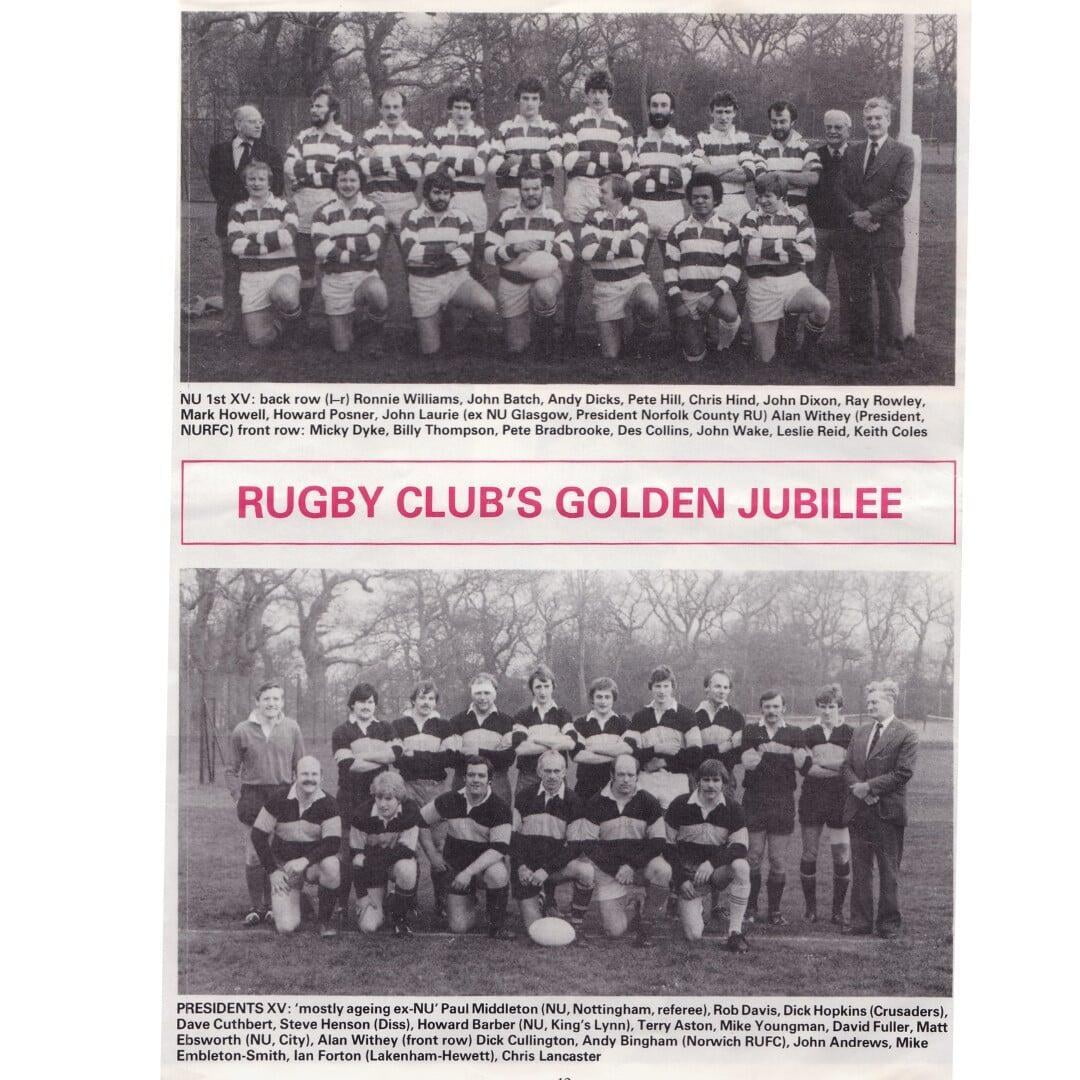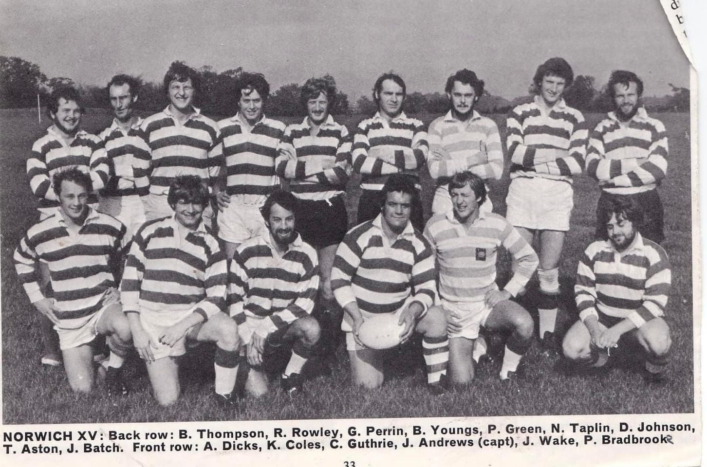 "Barrie Tuck had become Club President maybe a couple of years before and he'd made it his mission to win this competition, which we'd won a couple of times before in the early 60s. Since then NU had become a bit tighter with the purse strings, so we'd been quite restricted in the number of players we could bring in for the games (always played in London). Barrie had managed to get a big enough budget for us to get players in from all corners of the UK and Ireland (much like our main opponents, like CU and maybe the Pru). So we went for it and there's players here from Cork, Dublin, Belfast, Edinburgh, Cardiff, Preston, Reading, Northampton and Brighton. Seven players from Norwich. I think we may have lost this final, but we came back the following year and won the Cup, boosted by the likes of Donal Cannife, who captained Munster to inflict the only defeat of the All Blacks in their 1978/9 Tour of UK and Ireland."