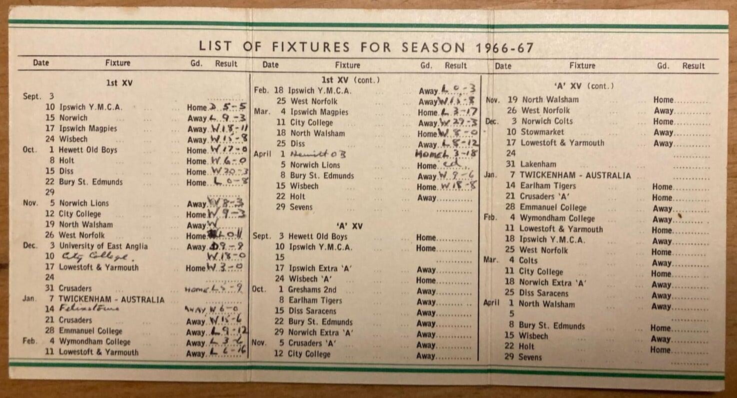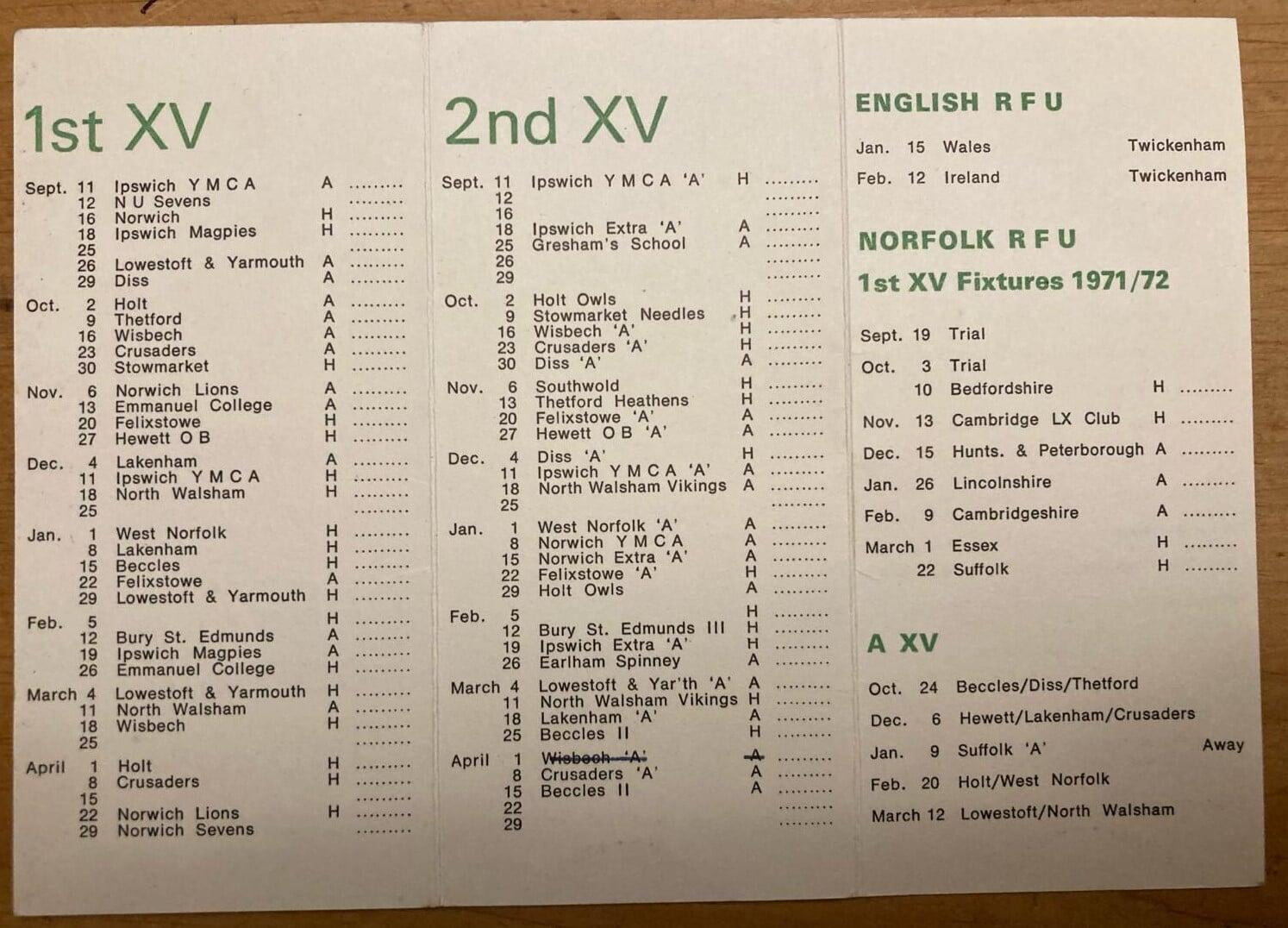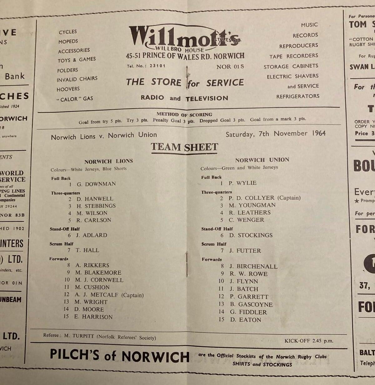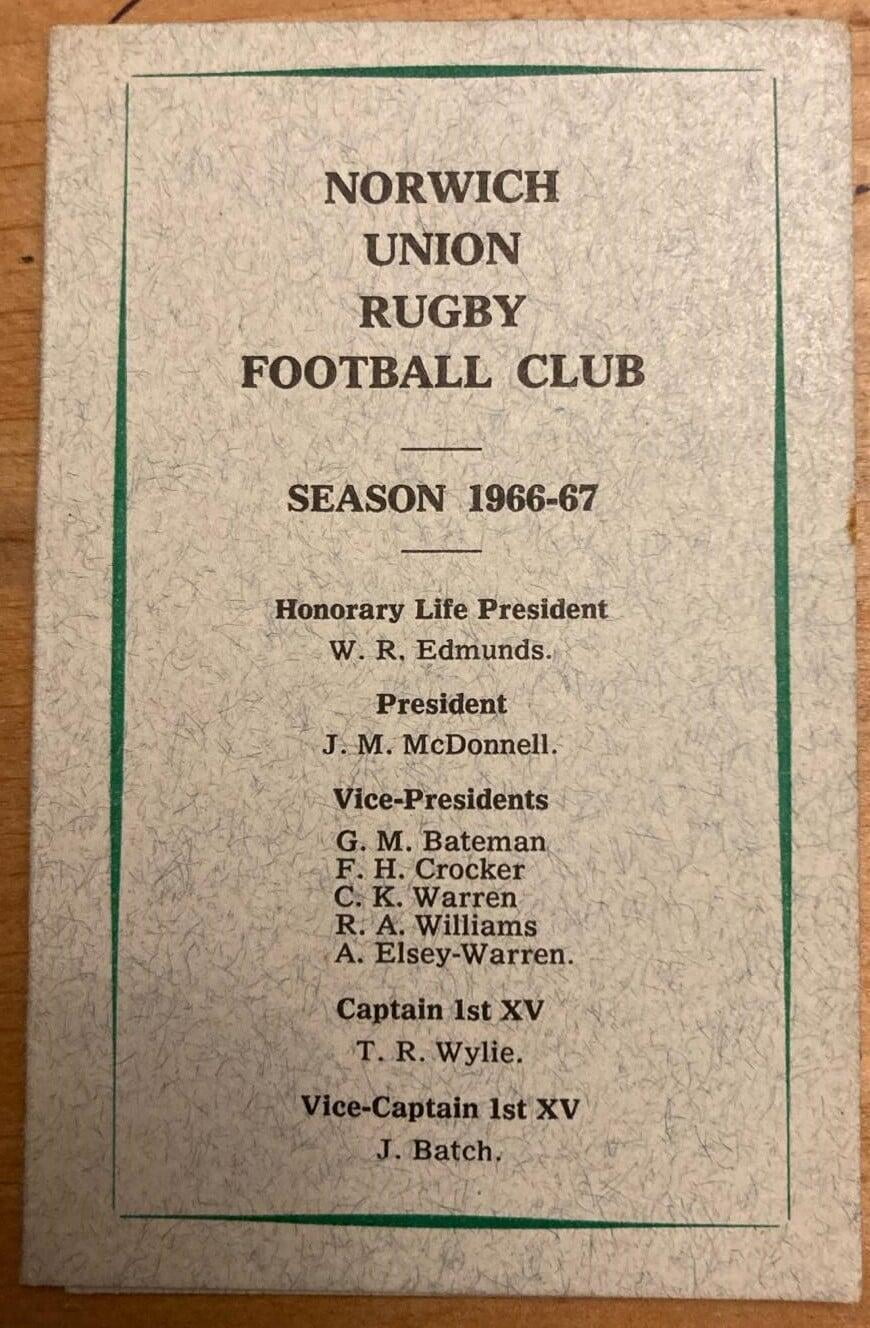 "Barrie Tuck had become Club President maybe a couple of years before and he'd made it his mission to win this competition, which we'd won a couple of times before in the early 60s. Since then NU had become a bit tighter with the purse strings, so we'd been quite restricted in the number of players we could bring in for the games (always played in London). Barrie had managed to get a big enough budget for us to get players in from all corners of the UK and Ireland (much like our main opponents, like CU and maybe the Pru). So we went for it and there's players here from Cork, Dublin, Belfast, Edinburgh, Cardiff, Preston, Reading, Northampton and Brighton. Seven players from Norwich. I think we may have lost this final, but we came back the following year and won the Cup, boosted by the likes of Donal Cannife, who captained Munster to inflict the only defeat of the All Blacks in their 1978/9 Tour of UK and Ireland."