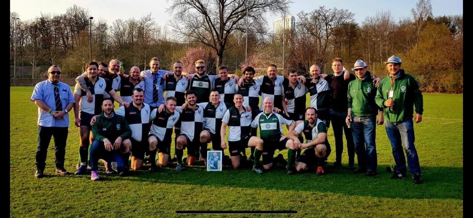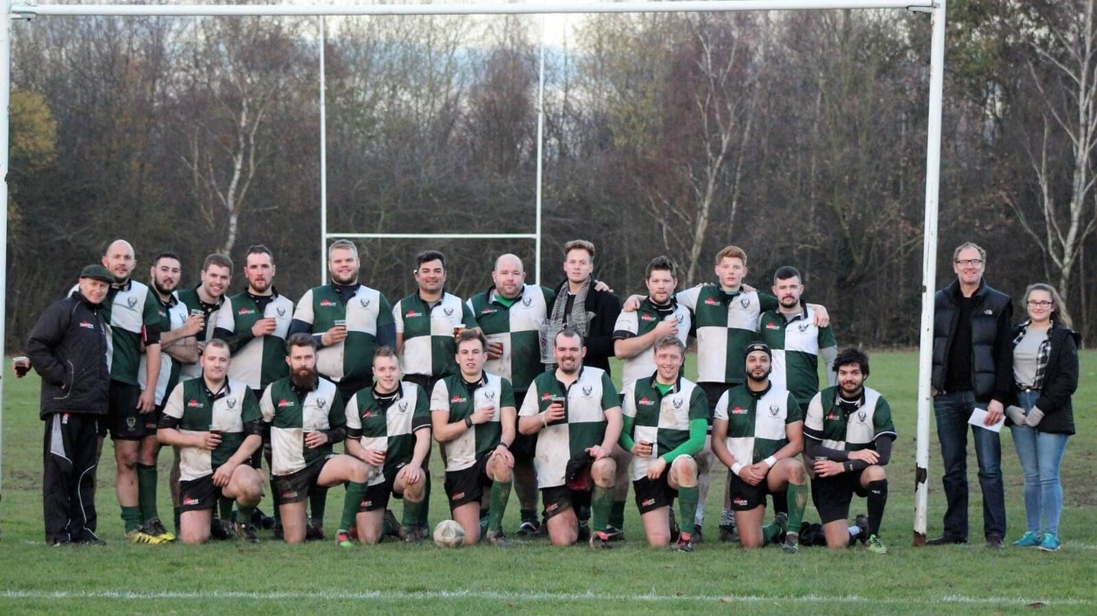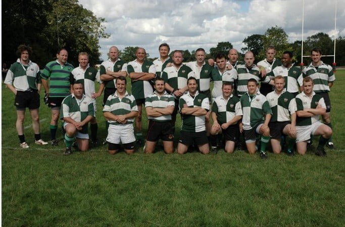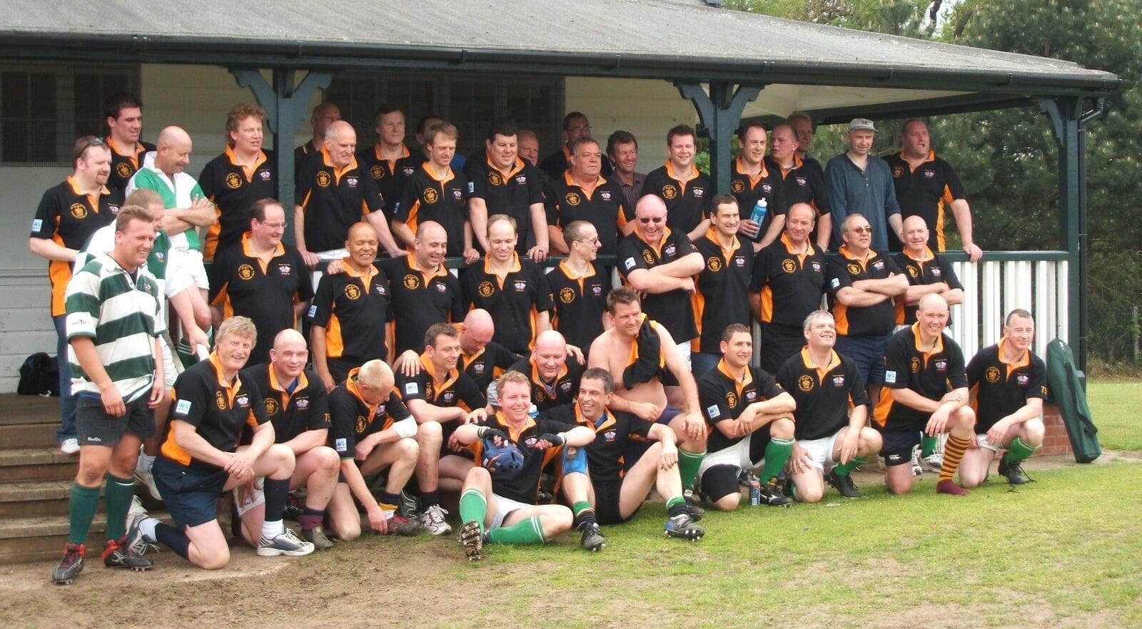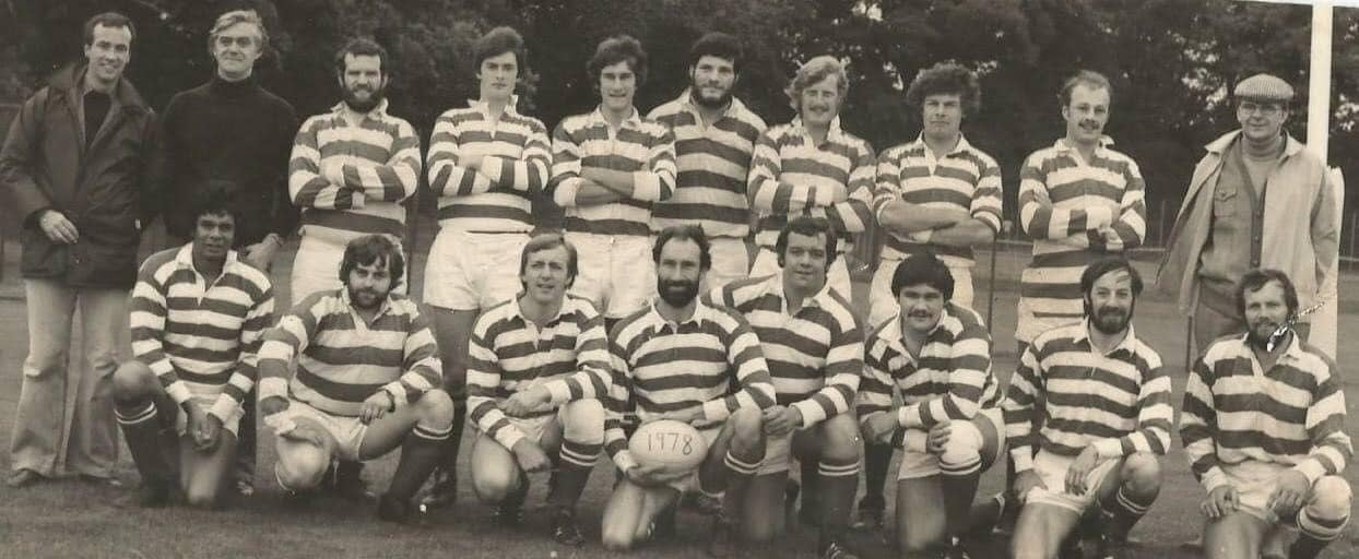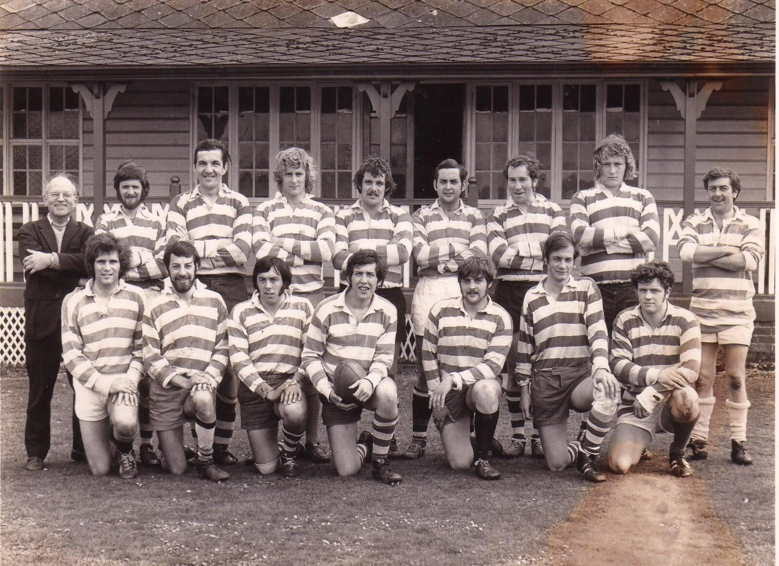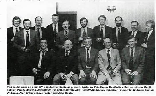 From rear left Standing: Barrie Tuck (NURFC President), Lyn Porter, Owen, Ray Rowley, Keith Coles, Terry Aston, Peter Rawlins, John Batch, Des Collins, David Douglas, Phil Wilkinson, Jeff Marais, John Wake.